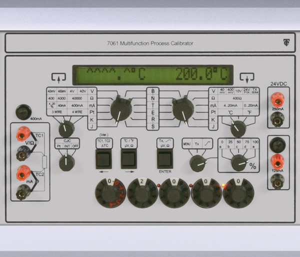 The 7061 process calibrator module combines the essential functions of measurement and simulation of volts, millivolts, milliamps, and ohms with the direct readout simulation of thermocouples and RTD's in °C or °F units. Input and output functions are displayed simultaneously and the switch controls allow for easy and precise operation.