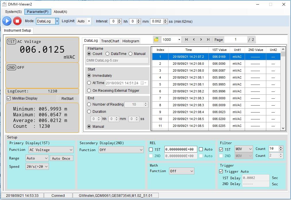 The PC software DMM-Viewer2 is suitable for any computer communications interfaces (RS232C/LAN/USB/ GPIB) provided by the GDM-906X series for long-term data acquisition. The software not only allows users to control the settings of the GDM-906X series but also provides the observation mode or the recording mode for the captured data. For the observation mode, the measurement result is directly presented as the result of the trend chart or the histogram and the result is not saved. For the recording mode, the measurement result is directly saved into the log file, but only the current display is shown in the process. The measured data and trend chart can be viewed after the recording mode is stopped. In addition, the GDM-906X series also provides LabVIEW driver to meet the software application requirements of system integration.