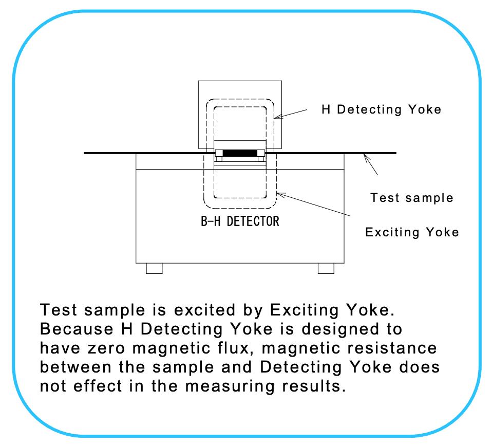 The Steel Sheet Tester Model DAC-BHW-6 is capable of measuring magnetic flux density (B), magnetizing force (H), and core loss (W) of an electromagnetic steel sheet (a single strip sheet). The measuring method of DAC-BHW-6 differs from the conventional Single Sheet Test (SST) of IEC in that it applies the Magnetic Potentiometer method into the magnetic circuit. The tester measures a magnetic potential between 2 points in the magnetic field. In this style, stable and reliable measurement is possible because the measurement is unaffected by a gap between a test sample and a detecting yoke.