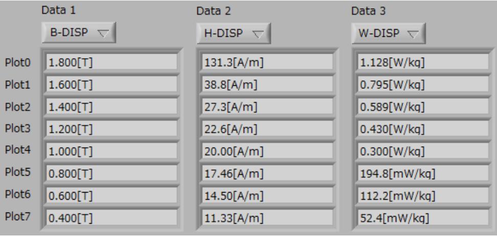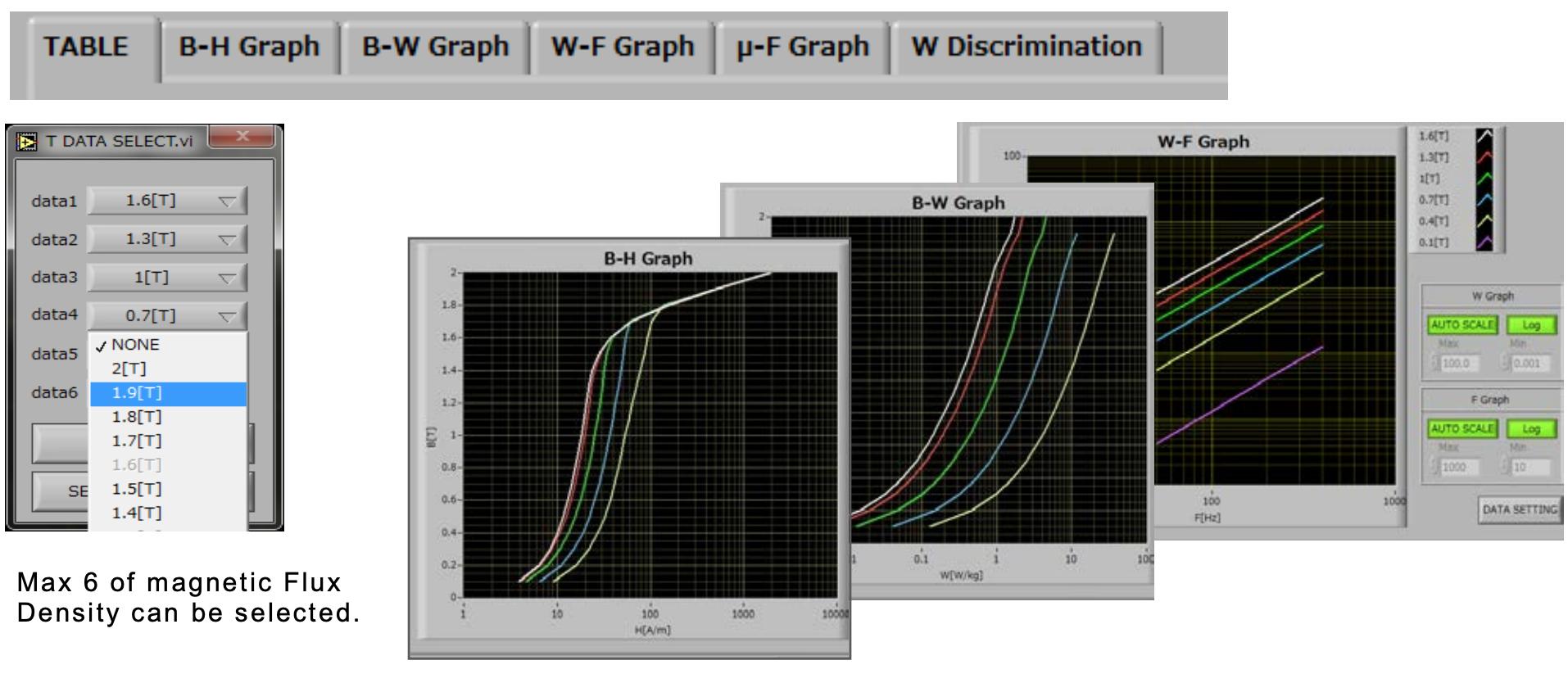 You can choose Max 8 data from the stored CSV files, and create overlay-graph of B-H curves. Associated information of test conditions will be displayed in a list for easy comparison, and the group data can be saved in .dat format.