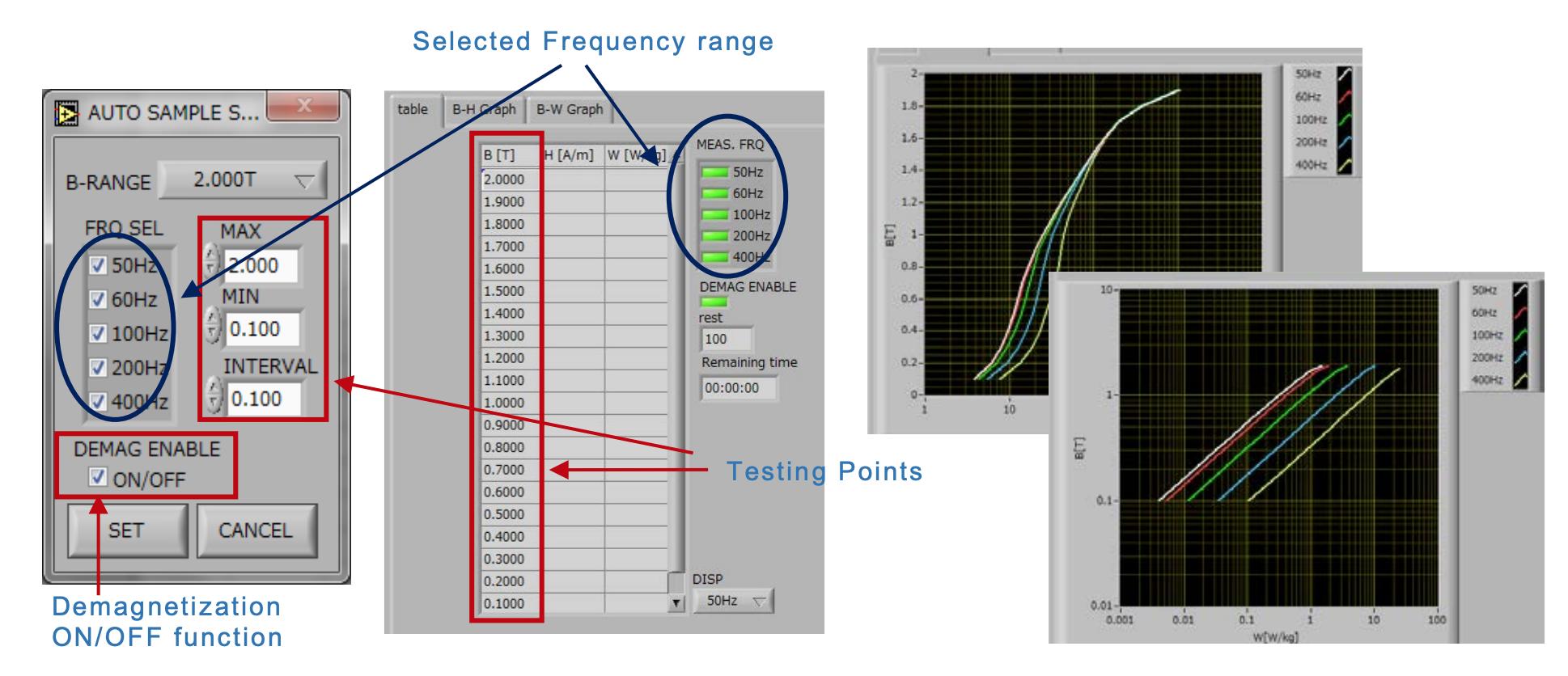 In Auto Sample Mode, B-H Graph and B-W Graph of each frequency range are created automatically.