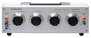 Kenwood TMI / Texio RA-920A: The RA-920A resistance attenuator features a wide range of applications for use in measuring levels filter efficiency transmission efficiency amplifier gain etc. The attenuation range is from 0 to 12 dBî minimal attenuation step is 0.1 dB attenuation accuracy is ±0.2db maximum input level is 27 dBm and the input/output impedance is 600O. The frequency range is as wide as DC to 1 MHz. The circuit includes unbalanced-T and bridge-T networks and large dial knobs are easy to handle when switching ranges